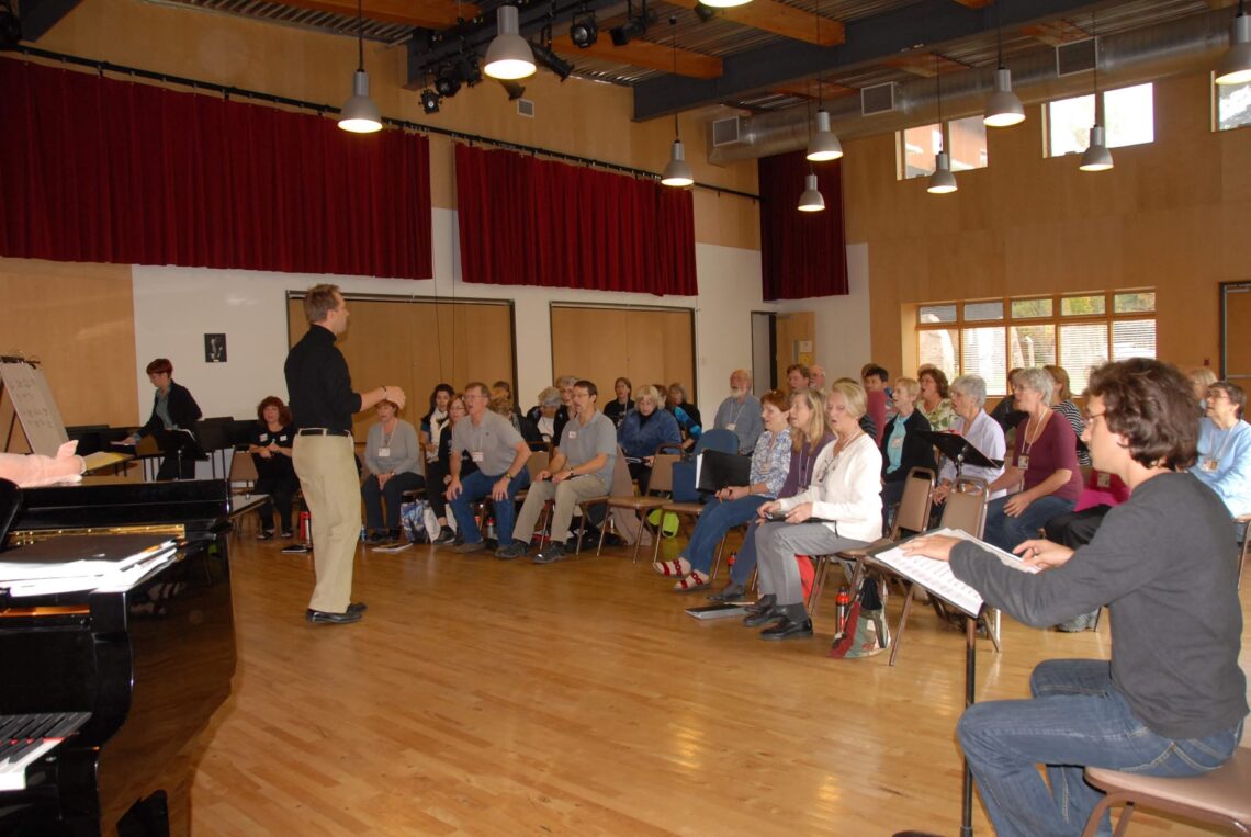 Since fall 1993, Coro Vivo has held an annual weekend workshop at the beautiful premises of CAMMAC (Canadian Amateur Musicians/Musiciens amateurs du Canada) in the Laurentian Mountains. On these occasions, the choir hires a guest music director to lead the workshop, including talented directors such as Robert Ingari, Laurence Ewashko, Isabel Bernaus, Robert Filion, Iwan Edwards, Barbara Clark, Mark Sirrett, Lisette Canton and Michael Zaugg. While we take the training and teaching very seriously, and we sing and sing and sing some more, we also enjoy a bit of fun and frolic. The polar bear swim was one of the main events, although the participants were not too plentiful. Our “show” on Saturday night is just for us as we entertain each other with limericks, songs, stories and games. There may even be a prank or two. The themes from the weekend range from “twins” to Halloween. Even our guest conductors get in on the fun. The doors are decorated and the food is good. By the end of the weekend we are happy, tired and have learned a lot about our music and ourselves. ps, …… make sure to ask a chorister about the “Piggy Award”, ……